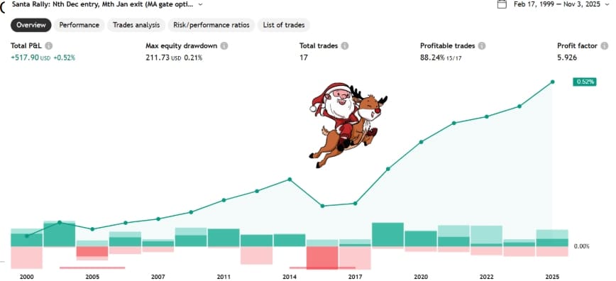 Det såkalte Santa Claus Rally har i mange år ført til stigende aksjekurser generelt hen over julen. Her er det en graf (nedenfor) som viste avkastningen i den store S&P500 aksjeindeksen, hvis man hadde kjøpt den 14. handelsdagen i desember og solgt igjen den 10. handelsdagen i januar i de årene hvor prisen er over et glidende gjennomsnitt på 200 (daily).