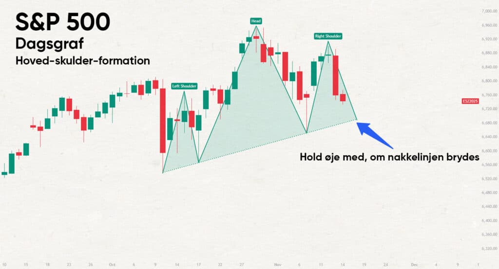 Går vi ned til dagsgrafen, ser vi et tredje signal: et potensielt såkalt hode-skulder-mønster. Venstre skulder, hode og høyre skulder ses tydelig, og prisen ligger akkurat nå tett på den stigende nakkelinjen: