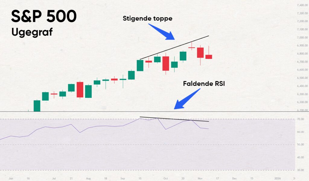 Ser vi på indikatoren RSI på ukegrafen, ser vi det neste advarselssignalet. Prisen har laget høyere topper i løpet av sommeren og høsten, men RSI har laget lavere topper. Det er klassisk negativ divergens.