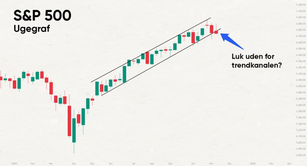 Siden mai har S&P 500 beveget seg i en tydelig definert stigende trendkanal på ukegrafen. Den har vært respektert nesten perfekt i mer enn et halvt år. I skrivende stund (fredag 14. november kl. 10.00) ligger prisen under den nedre trendlinjen – altså risiko for en første lukking utenfor kanalen.